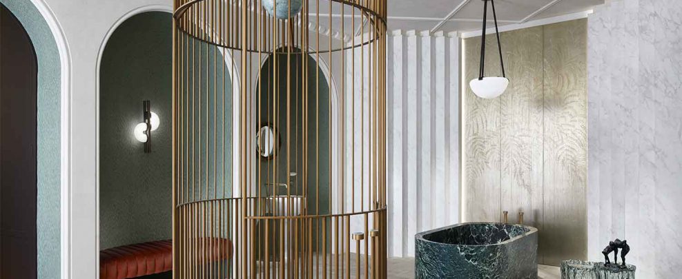 Duval et Mauler a réalisé les enduits sur les murs et plafonds ainsi que les peintures. Une belle collaboration avec Humbert & Poyet, nos confères de Tollis et Argile Peinture pour cette salle de bains néoclassique. Les niches en arc accueillant banquettes et vasques de part et d’autre de cette salle d’eau toute en symétrie renvoient aux villas palladiennes autant qu’aux palais Art déco. La baignoire en monolithe de marbre vert et la très sculpturale douche-cage en laiton insufflent force et vigueur à cet espace quand les bas-reliefs en métal patiné et les fresques estompées apportent finesse et sensualité. Rigueur et douceur ici se mêlent.